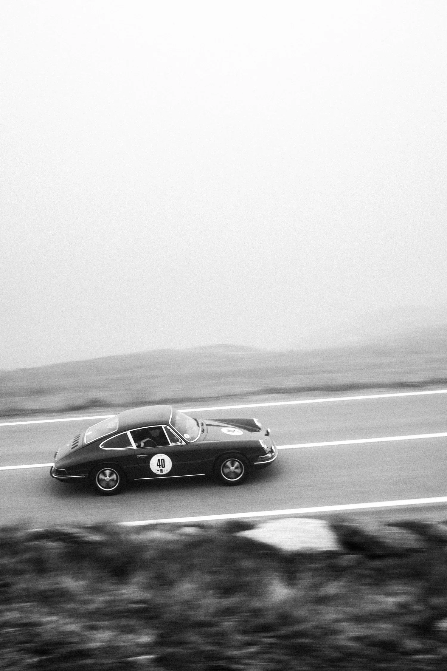 A Porsche 912 — the four-cylinder sibling of the 911 — captured at dawn during the Bernina Gran Turismo hill climb. Designer Carl Gustav Magnusson’s much-admired 912 isn’t a showpiece: it’s a proper driver’s car, refined through a quiet evolution of personal design decisions. Clean, precise, and pared back to the essentials, it heads up the foggy morning road toward the Bernina Pass, September 2017.